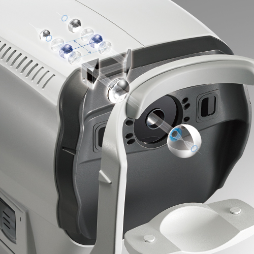 - The Aiming Dot quickly guides you to easily find the patient’s visual apex from any position for fast alignment. Reliable refractive power REF data is then automatically obtained.