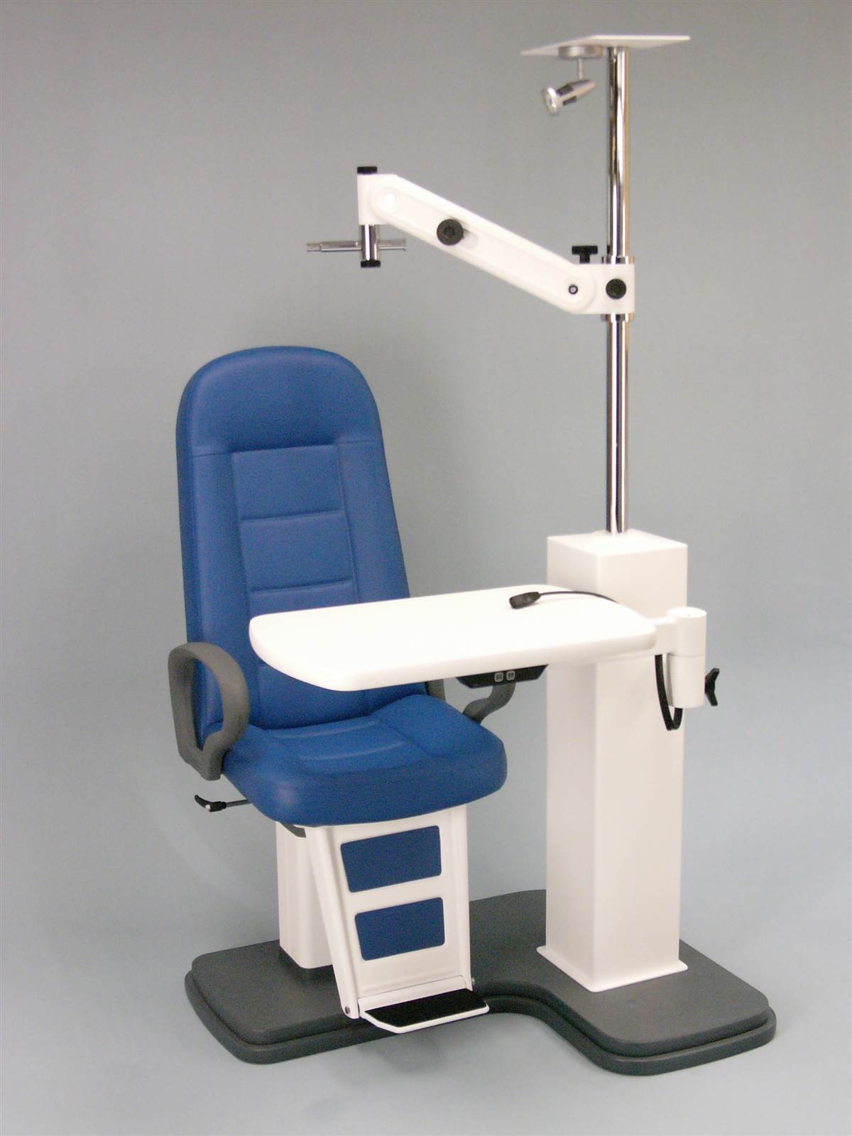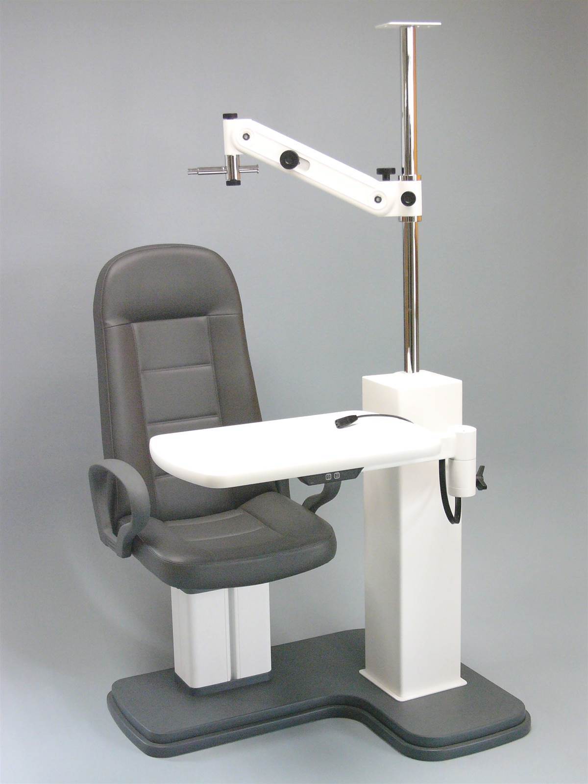 Refraction unit with fixed height table for one instrument, with mechanic locking of table arm in all positions, with chair with electric height adjustment. Very compact dimensions: only 100 cm wide! Available both in right and in optional left handed versions.