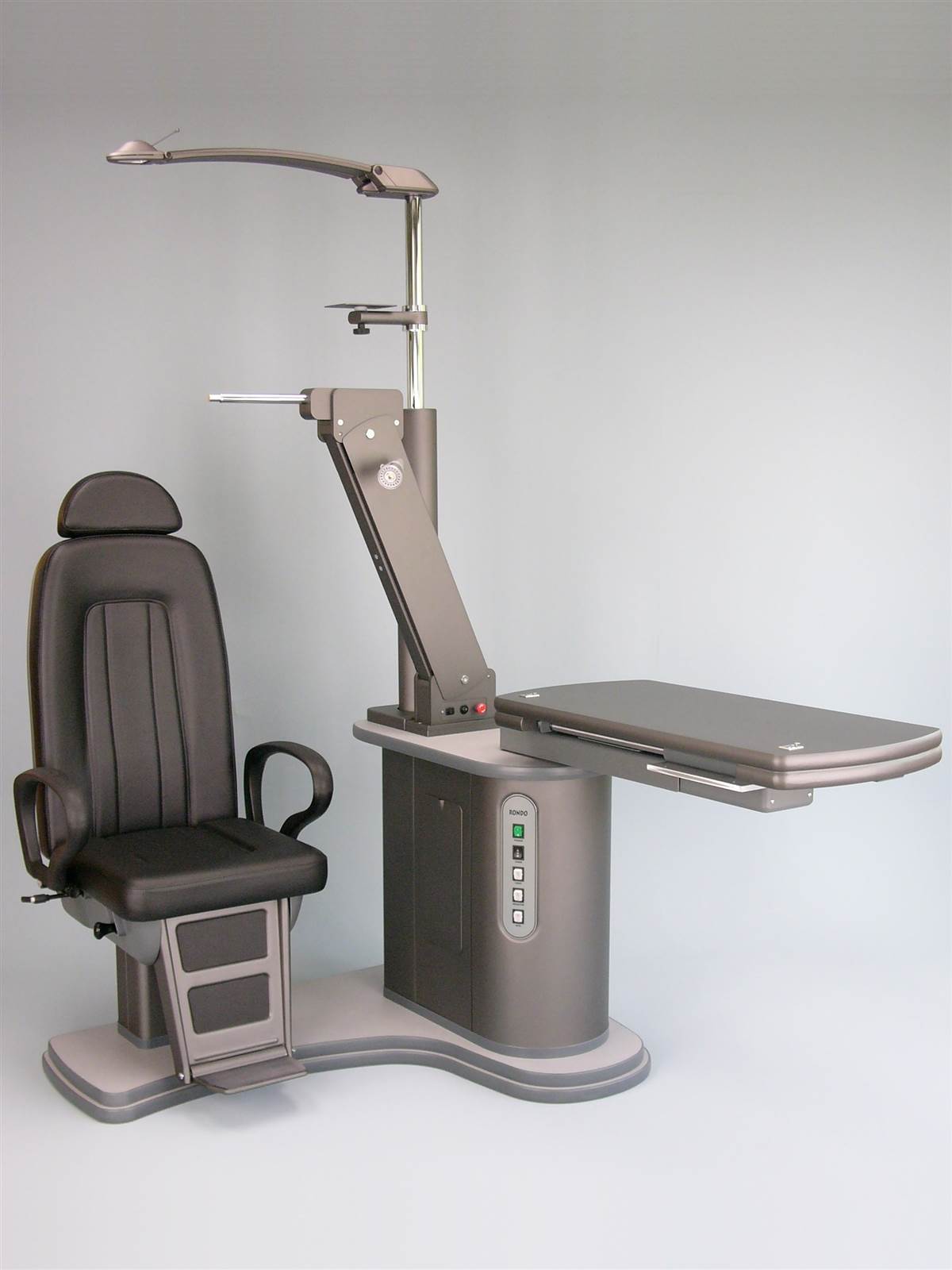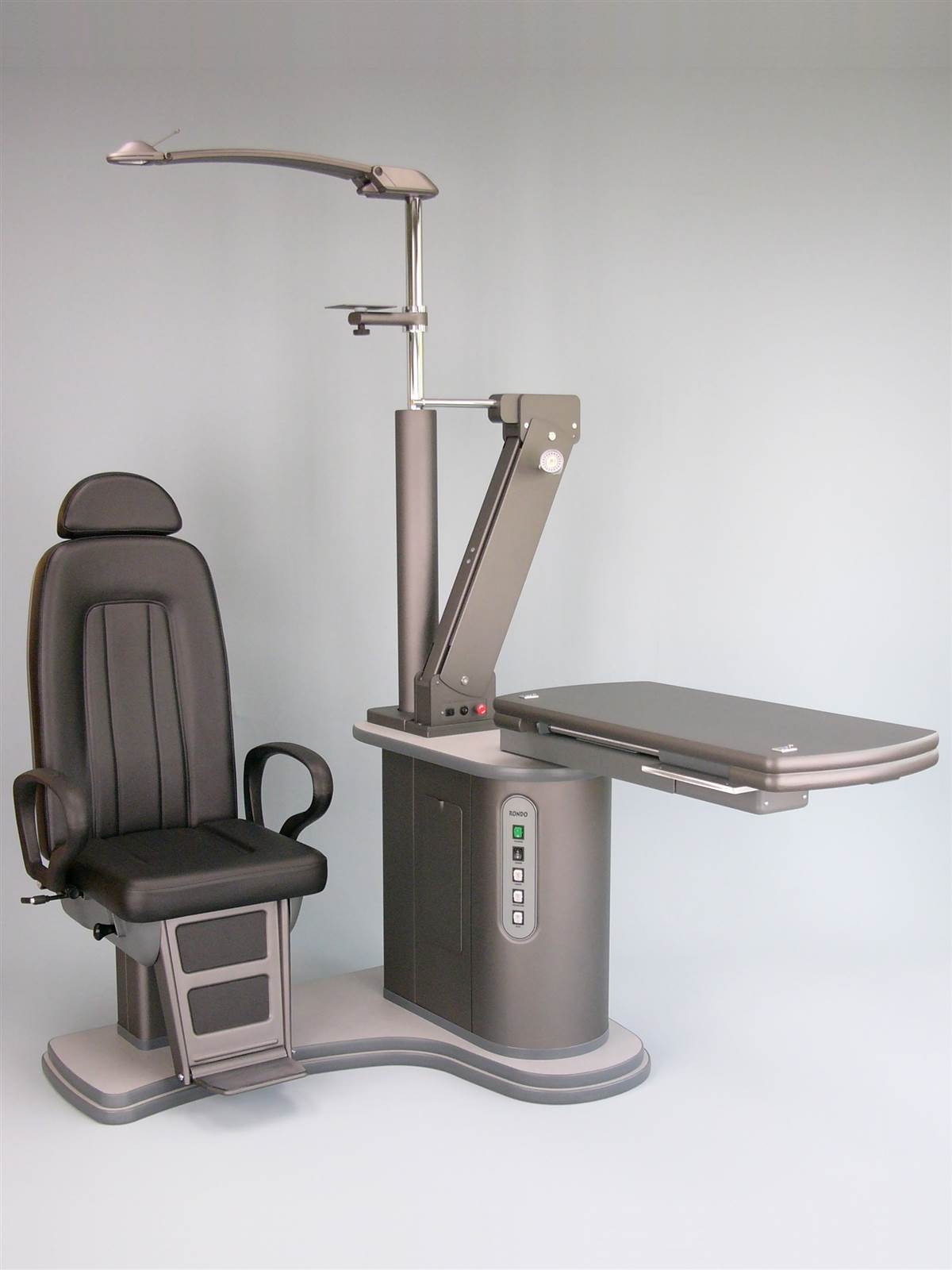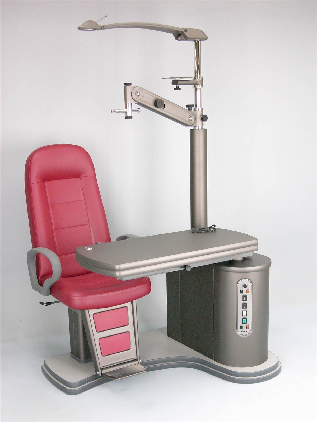 Refraction unit with either sliding or V shaped table for two instruments, with either fixed height or electric up/down movement, with electromagnetic locking of table arm, with chair with electric height adjustment. Available both in right and in optional left handed versions.