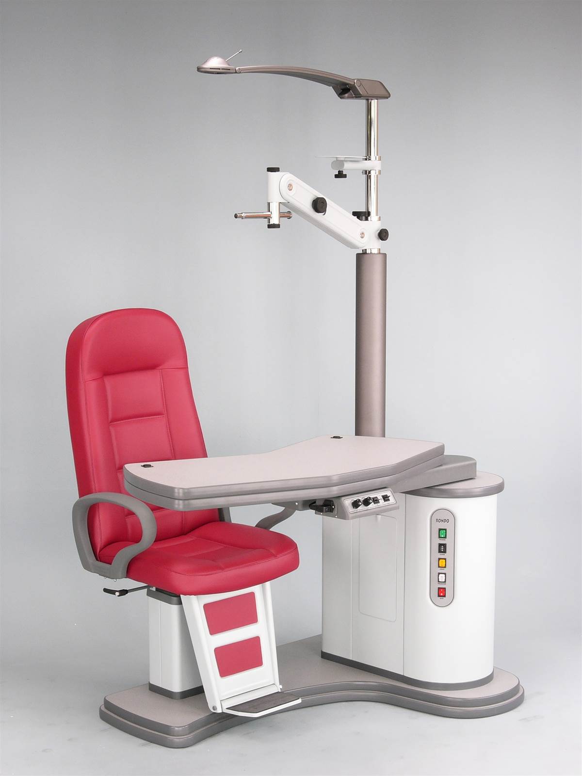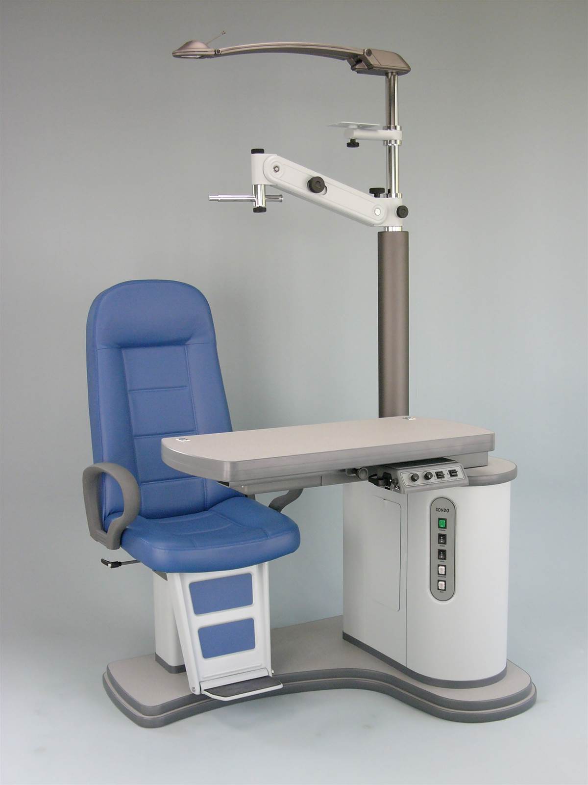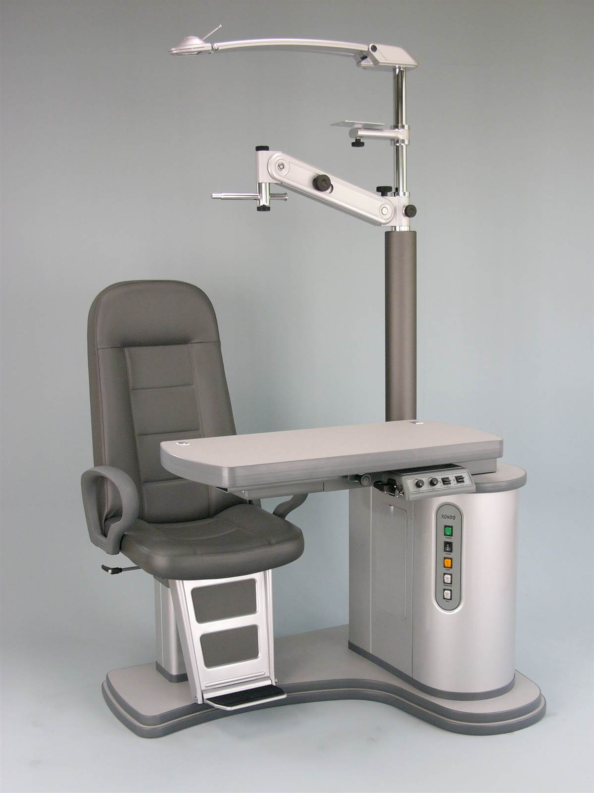 Refraction unit with either sliding or V shaped table for two instruments, with either fixed height or electric up/down movement, with electromagnetic locking of table arm, with chair with electric height adjustment. Available both in right and in optional left handed versions.
